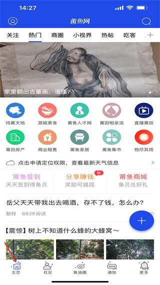 1、首頁瀏覽熱門內容,含美食房產等功能入口,可參與簽到分享賺魚貝,點擊+按鈕就能發布各類內容。