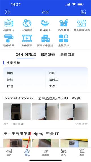 2、進入社區頁面查看版塊分類,含24小時熱點與搜索熱榜,可瀏覽用戶發布的信息,方便參與互動交流。