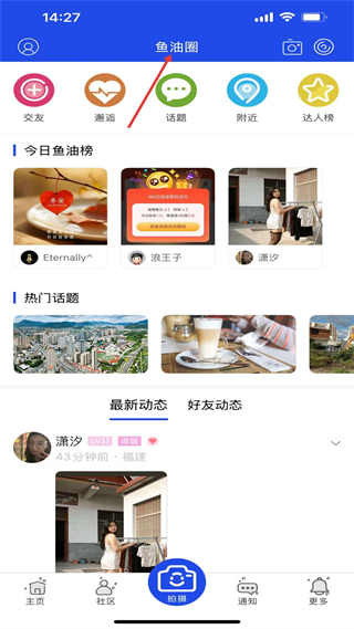 3、進入魚油圈頁面用交友話題等功能,查看今日魚油榜及熱門話題,瀏覽最新動態,點拍攝可發布內容。