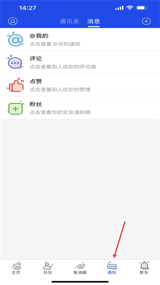 4、進入通知頁面看@我的評論點贊等通知,還能切換至通訊錄頁面,便于管理自身的社交關系。