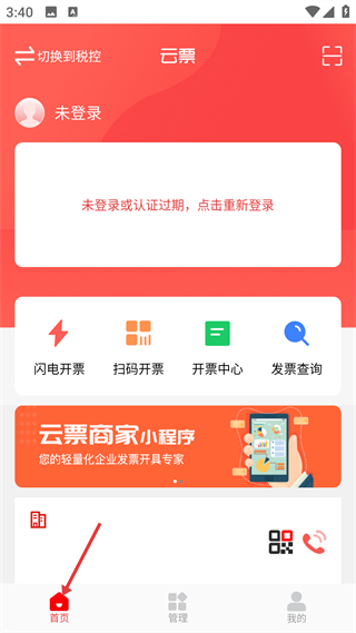 3、首頁模塊顯示未登錄狀態提示,整合閃電開票、掃碼開票等功能入口,是發票業務操作的綜合啟動頁面。