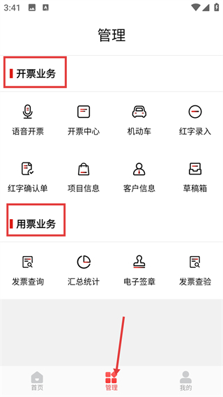 4、管理模塊分為開票業務與用票業務,涵蓋語音開票、發票查詢等功能,是發票全流程管理的核心操作界面。