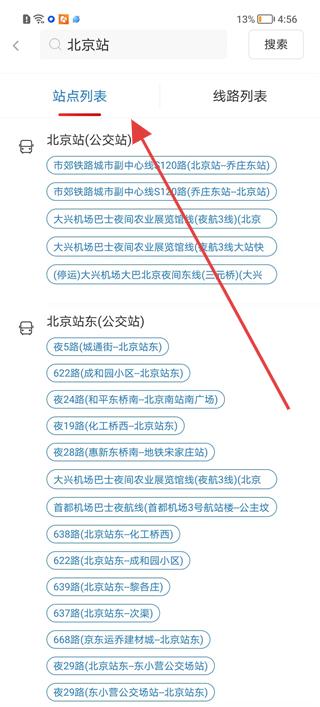 4、在站點搜索頁面,輸入北京站,查看站點列表中的北京站公交站等相關站點,了解各站點的公交線路信息。