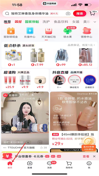 1、首頁有搜索、分類導航及低價秒殺、超值購等板塊,展示直播和商品推薦,功能豐富,滿足購物瀏覽與優惠獲取需求。