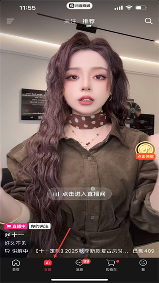 2、直播板塊可觀看關注的主播直播,如十一的復古風時裝直播,方便用戶參與直播購物,獲取時尚單品。