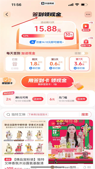 4、簽到領現金板塊可通過簽到、看視頻積累現金,有優惠券可領,為用戶提供購物優惠與激勵,提升購物性價比。