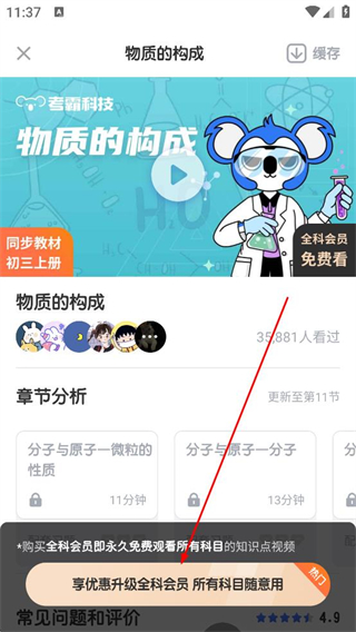 4、登錄后選擇同步教材對應的學習內容,進入物質的構成章節頁面,查看章節分析,了解該章節包含的知識點及對應視頻時長。