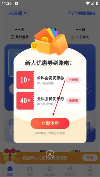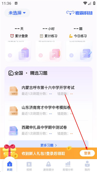 1、打開初中物理大師app,關閉新人優惠券彈窗,進入刷題頁面,查看累計登錄及練習數據,瀏覽精選習題板塊的各類試卷資源,了解可用練習內容。