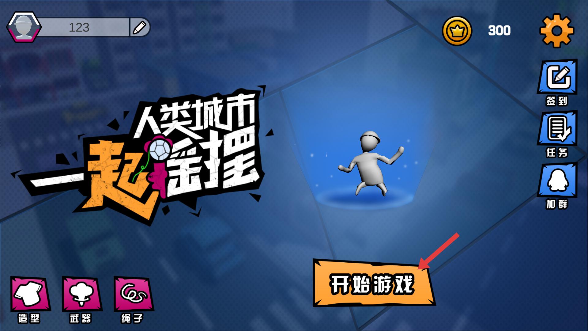 1、游戲初始界面,點擊開始游戲按鈕,即可進入游戲場景,開啟在城市中搖擺的冒險。