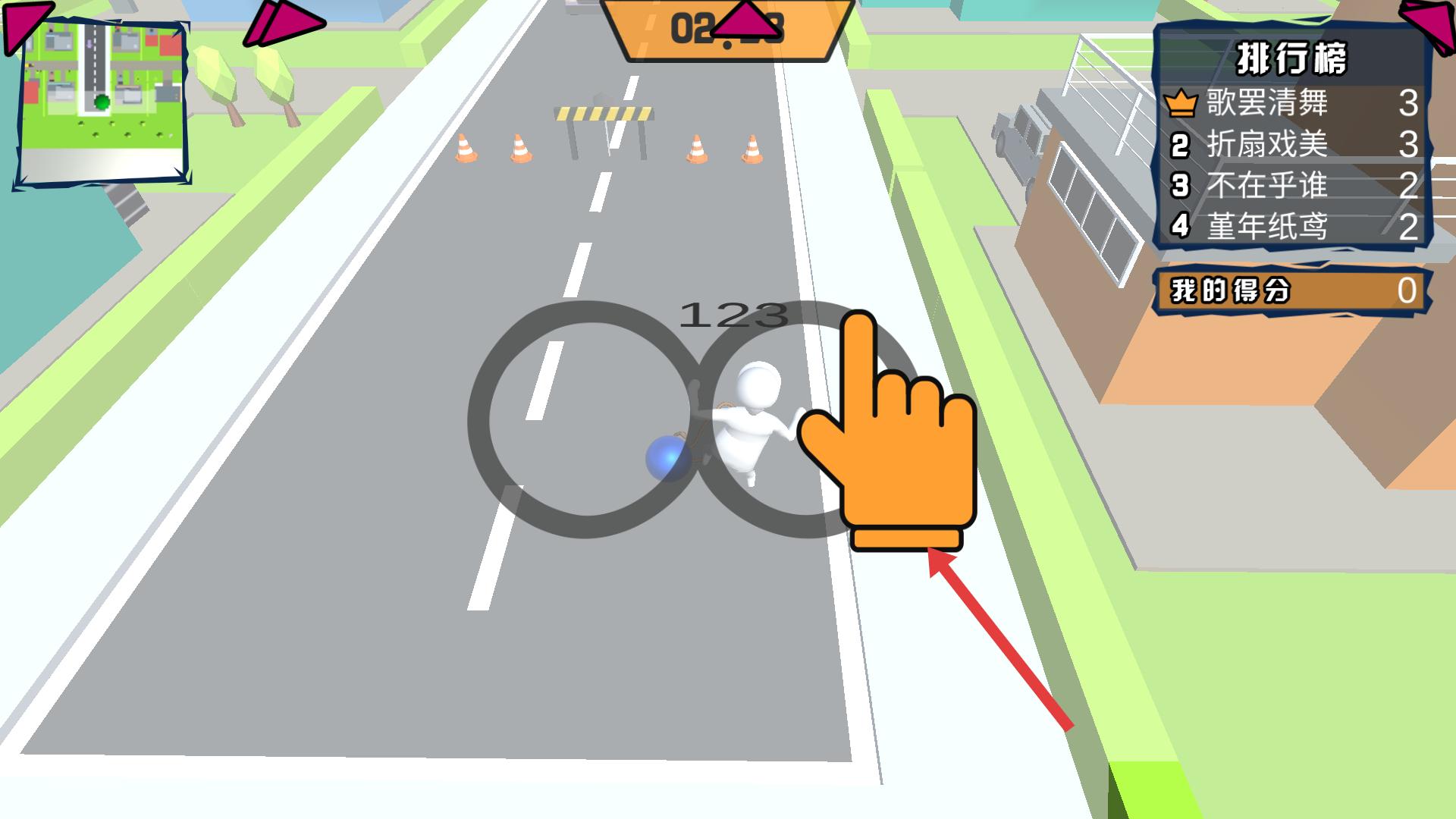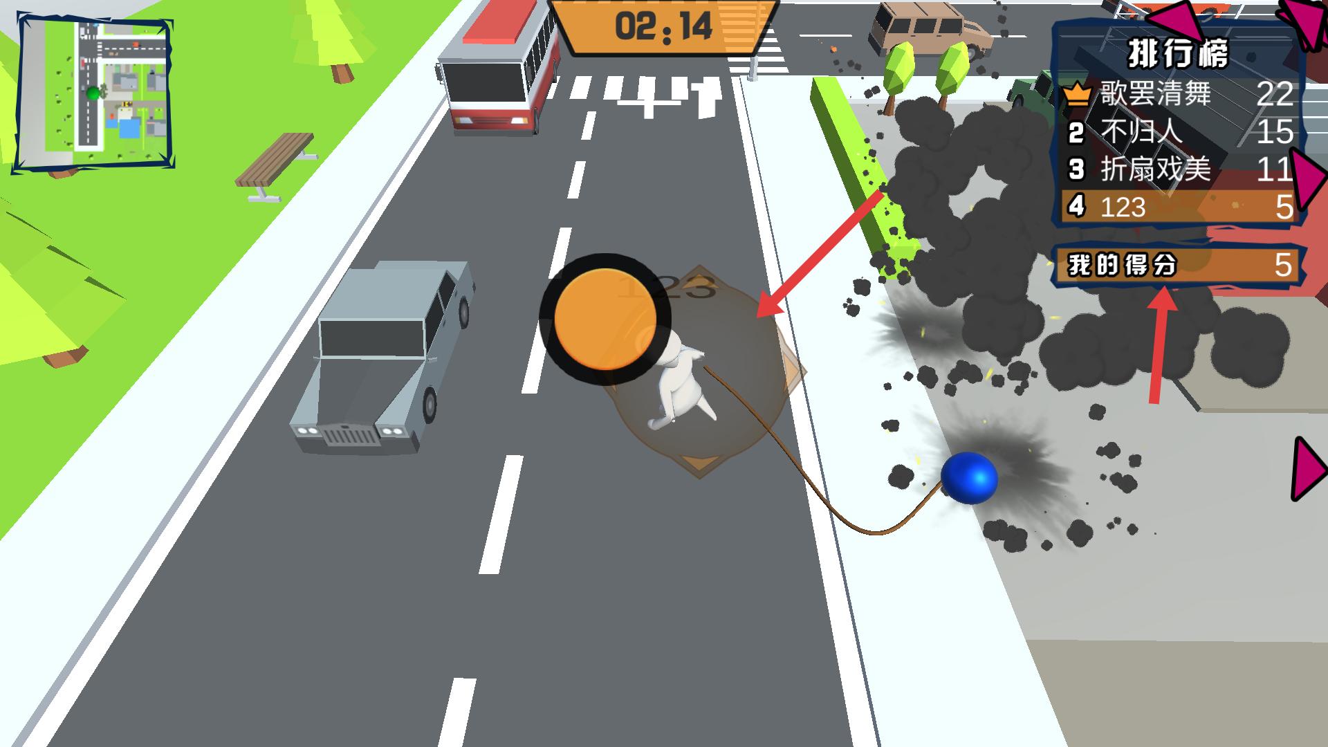 3、游戲過程中,操控角色利用道具,如藍色球體,撞擊路邊物體,獲取分數,提升自己在排行榜的名次。