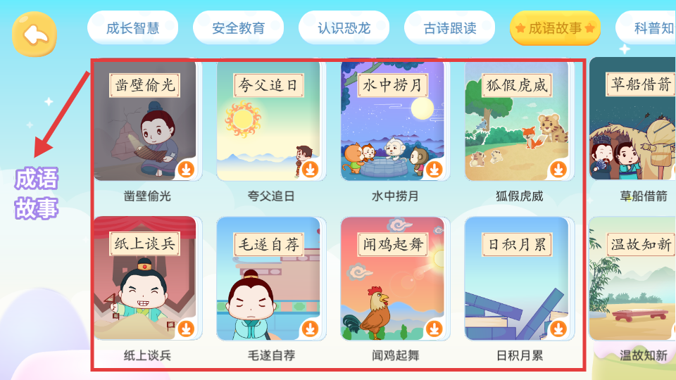 1、兒童教育APP的成語故事界面,展示鑿壁偷光、狐假虎威等經典故事,以生動卡通畫呈現,助孩子輕松學成語。