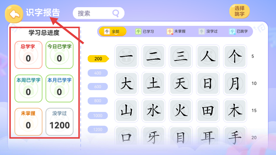 3、識字報告頁面,清晰呈現總學字、今日已學字等進度數據,右側排列漢字,支持跳字選擇便于個性化學習。