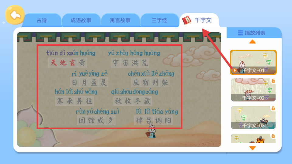 4、古詩文學習板塊聚焦千字文,逐句展示如天地玄黃,宇宙洪荒等內容并標注拼音右側有播放列表。