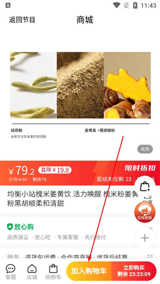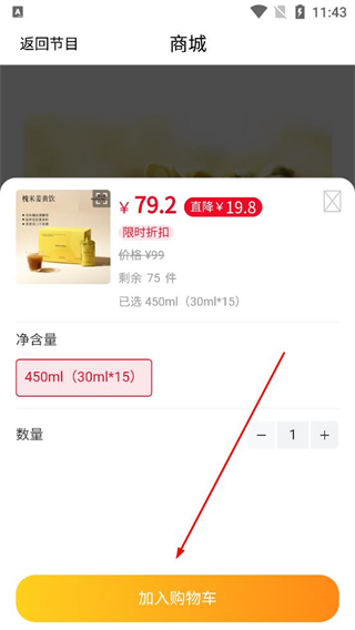 3、在商品詳情頁,確認商品規格及數量,點擊加入購物車按鈕,將該姜黃飲商品添加至購物車中。