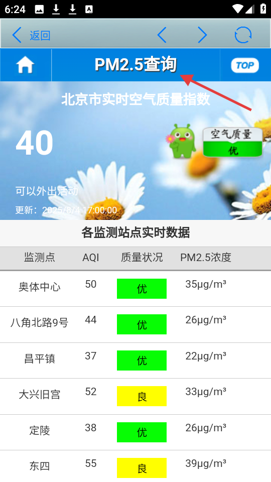 2、北京市實時空氣質量指數為40,空氣質量優,各監測站點數據略有不同,總體適宜外出活動。