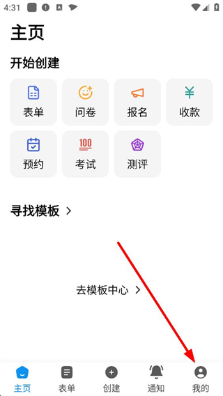 1、進入金數據主頁,能看到表單問卷等創建功能選項,點擊底部我的選項,即可進入對應的賬號相關頁面,開啟登錄流程。