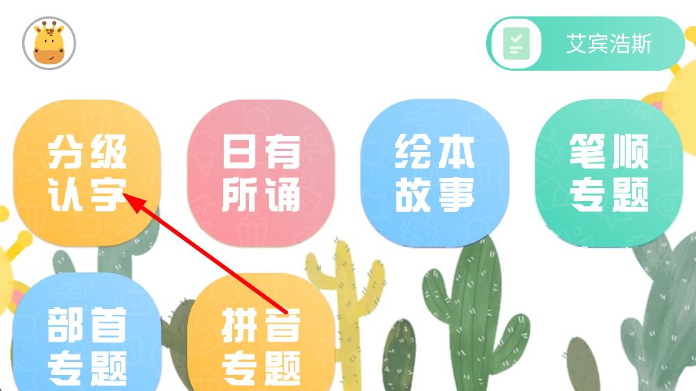 1、進入應用首頁可看到分級認字、日有所誦等功能模塊,點擊分級認字選項,可進入章節學習頁面,開啟識字學習流程。