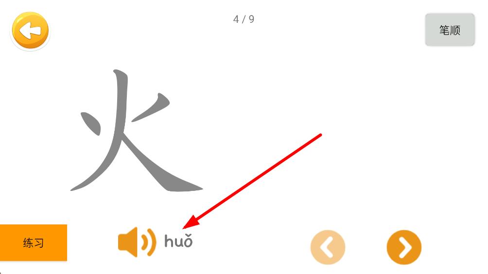 4、火字的學習界面,點擊發音按鈕可聽取該字讀音,還能查看筆順、進行書寫練習,助力掌握該漢字的基礎信息。