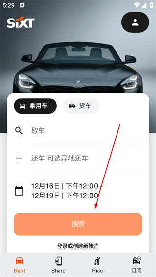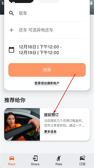 1、打開SIXT應用,進入取車頁面,填寫取車與還車信息,選定12月16日至19日的用車時段,點擊搜索按鈕,查看推薦的提前預訂優惠內容。