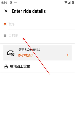 4、在行程詳情頁面填寫取車點與目的地信息,選擇是否多次停留或按小時預訂,也可通過地圖定位確定位置,完善行程的各項細節。