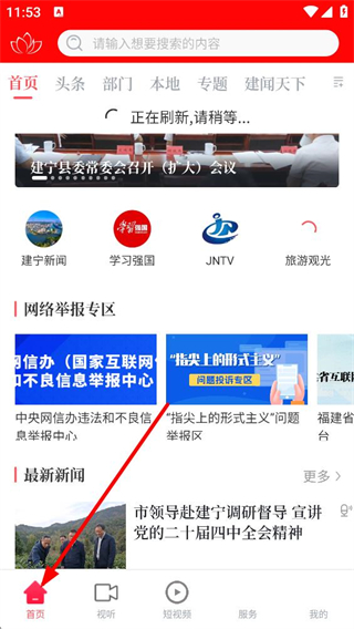 1、進入建寧融媒APP首頁,可看到頭條、部門等多個欄目,還有建寧新聞等入口,能瀏覽本地新聞和參與網絡舉報專區相關內容。