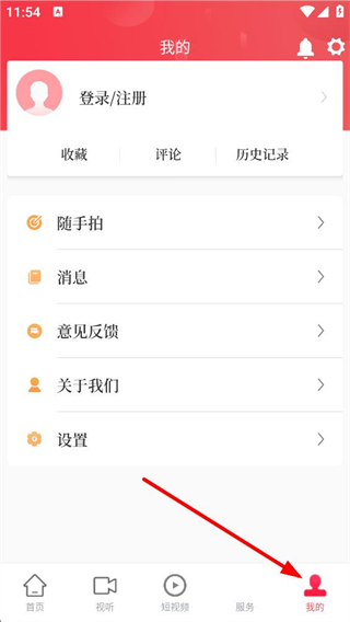 2、點擊底部我的按鈕,進入個人頁面,可進行登錄、注冊,使用收藏、評論等功能,還能參與隨手拍、意見反饋等互動。