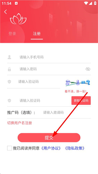 4、注冊頁面,輸入手機號碼、設置密碼,完成圖形驗證和短信驗證,閱讀并同意相關協議后點擊提交,完成賬號注冊流程。