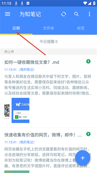 2、近期頁面展示近期筆記,有如何一鍵收藏微信文章等內容,還可快速收集網頁、微博等有價值信息。