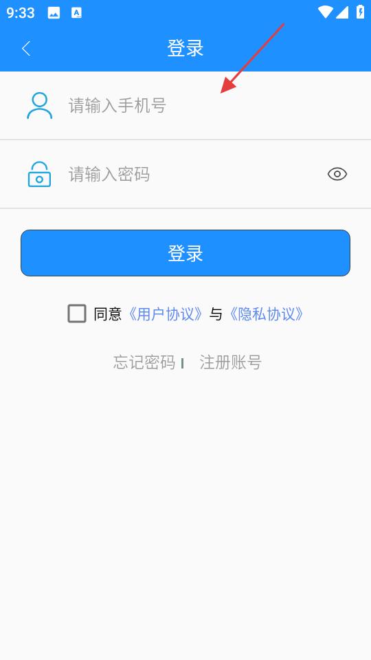 2、登錄頁面需輸入手機號和密碼,勾選同意用戶協議與隱私協議后,點擊登錄按鈕,若忘記密碼或需注冊賬號,也有相應選項。