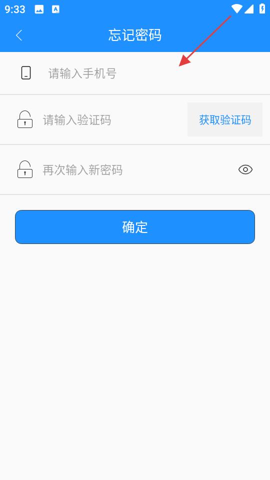 3、忘記密碼頁面,要輸入手機號,獲取并輸入驗證碼,再次輸入新密碼,完成后點擊確定即可重置密碼。