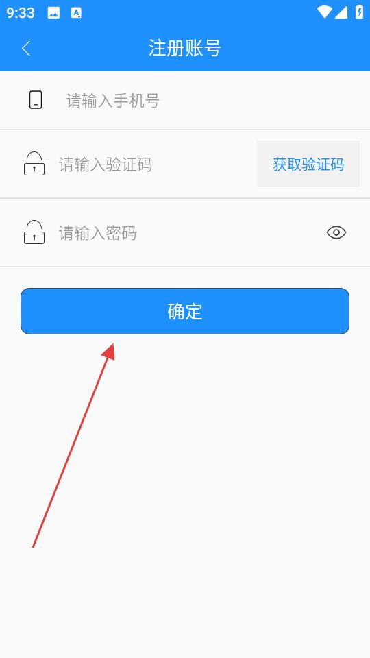 4、注冊賬號頁面,需輸入手機號,獲取并輸入驗證碼,設置密碼,最后點擊確定完成賬號注冊。
