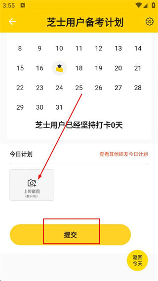 4、確認今日計劃的內容及上傳的材料無誤后,找到頁面中的提交按鈕,點擊該按鈕完成今日備考計劃的提交操作,記錄當日備考進度。