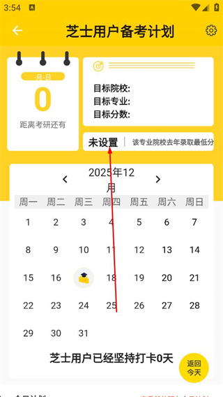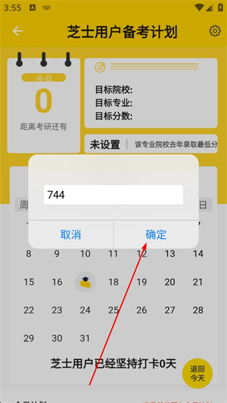 2、在備考計劃頁面查看距離考研剩余時間及目標信息,選擇對應日期,點擊目標分數區域的未設置,輸入目標分數后點擊確定按鈕完成設置。