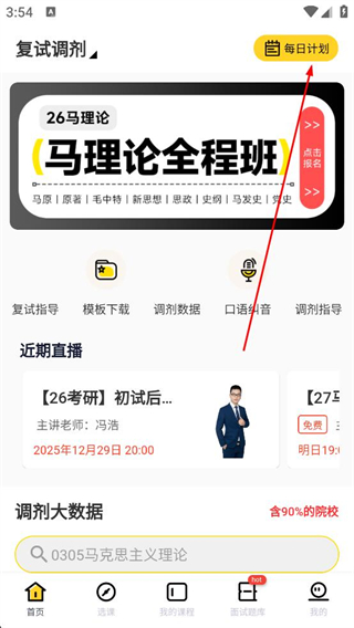 1、打開芝士考研軟件,進入復試調劑頁面,瀏覽展示的課程及功能選項,找到每日計劃按鈕,點擊該按鈕進入芝士用戶備考計劃頁面。