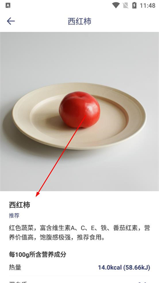 4、在蔬菜類中選擇西紅柿,查看其推薦說明及每100g所含營養成分,了解該食材的營養信息,輔助飲食記錄規劃。