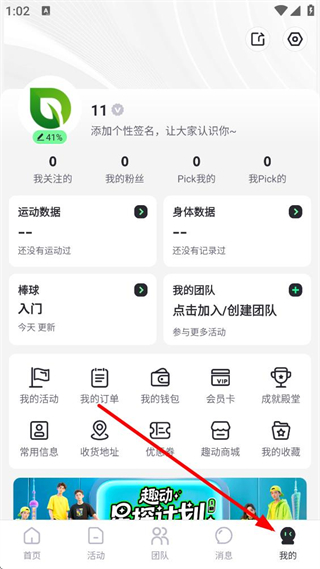 3、進入我的界面,可添加個性簽名,查看關注、粉絲等數據,還有運動數據、身體數據等板塊,也可進行我的活動、我的訂單等功能操作。