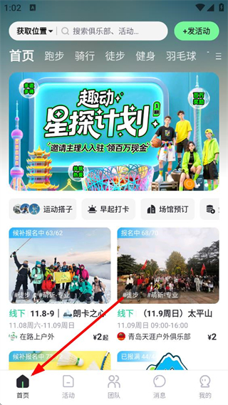 1、進入趣動WillGo首頁,可獲取位置、搜索俱樂部或活動、發活動,首頁有趣動星探計劃活動展示,還有運動搭子、早起打卡等板塊及徒步等線下活動推薦。