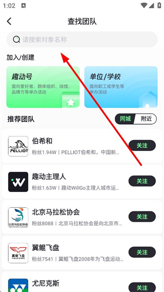 4、查找團隊界面,可搜索對象名稱,選擇加入或創建趣動號、單位學校團隊,還有伯希和、趣動主理人等推薦團隊,點擊關注可關注感興趣的團隊。