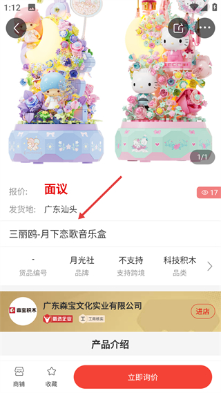 4、進入產品詳情頁,可查看玩具的發貨地、品牌等信息,還能直接聯系廠商詢價,實現高效的商貿對接。