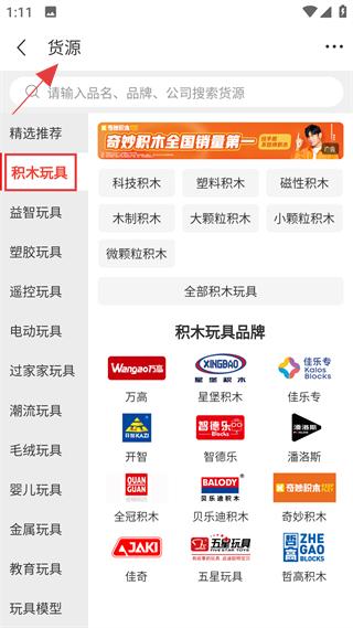 2、在貨源頁面選擇積木玩具分類,可查看細分類型與品牌,精準定位所需產品,助力快速對接玩具供應商。