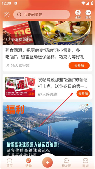 2、進入橙柿互動活動頁面,瀏覽各類活動內容,選擇感興趣的發帖說說那些出圈的領證打卡點活動,點擊去參加按鈕進入詳情頁。