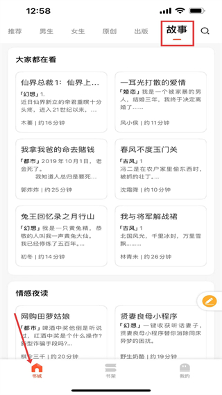2、書城故事板塊展示仙界總裁1、一耳光打散的愛情等短篇,涉及幻想、婚戀題材,提供短篇幅閱讀選擇。