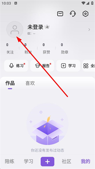 2、進入我的界面,可見未登錄狀態及關注等數據項,還有練習、報告等功能入口,當前作品板塊暫無已發布的動態內容。