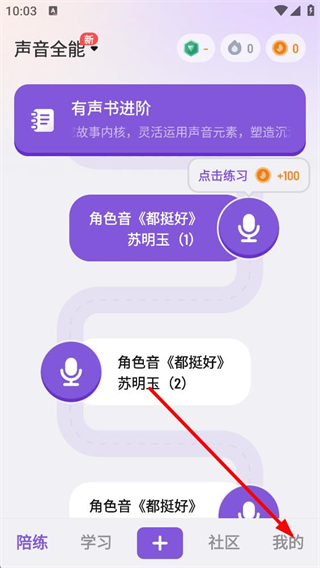 1、進入聲音全能陪練界面,能看到有聲書進階、角色音練習等內容板塊,點擊底部我的按鈕,可進入對應的個人相關界面。