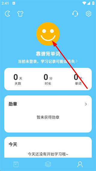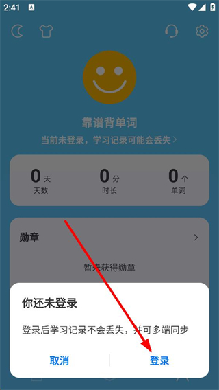 2、個人中心界面,能查看學習天數、時長等數據,還可查看勛章獲取情況,當前未登錄狀態下學習記錄可能丟失,需注意登錄保存。