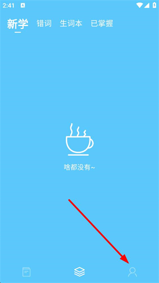 1、進入應用主界面,可切換新學、錯詞等標簽頁查看對應內容,當前新學標簽下暫無內容,可通過底部導航切換至個人中心等界面。