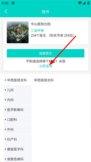 4、進入醫院掛號頁面后,可查看科室列表,支持搜索醫生,還能咨詢科室選擇建議,該平臺覆蓋預約掛號、報告查詢等全流程就醫服務。