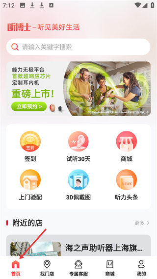 2、首頁有搜索功能,提供簽到、試聽30天等服務入口,還有附近門店推薦,助力用戶獲取聽力健康服務。