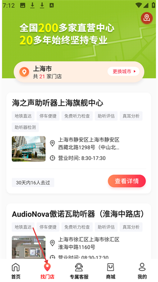 3、找門店頁可查看全國直營中心門店信息,支持更換城市,方便用戶查找附近聽力健康服務門店。