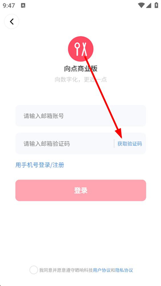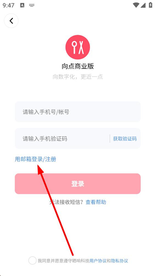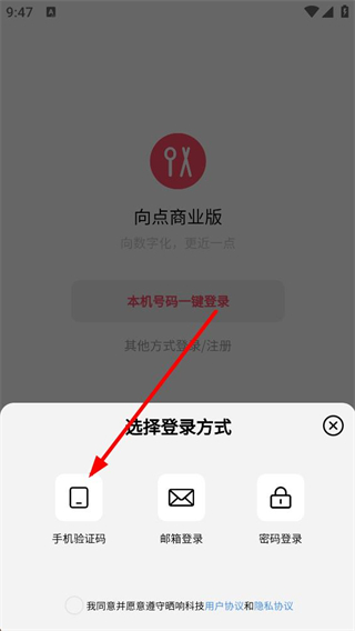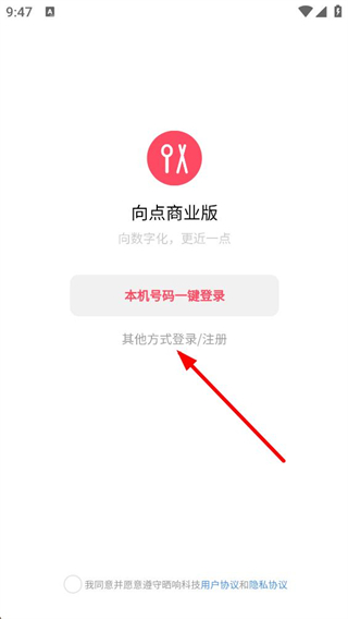 1、進入向點商業版登錄界面,可選擇本機號碼一鍵登錄,也能點擊其他方式登錄、注冊,需先勾選用戶協議才能進行后續的登錄操作。